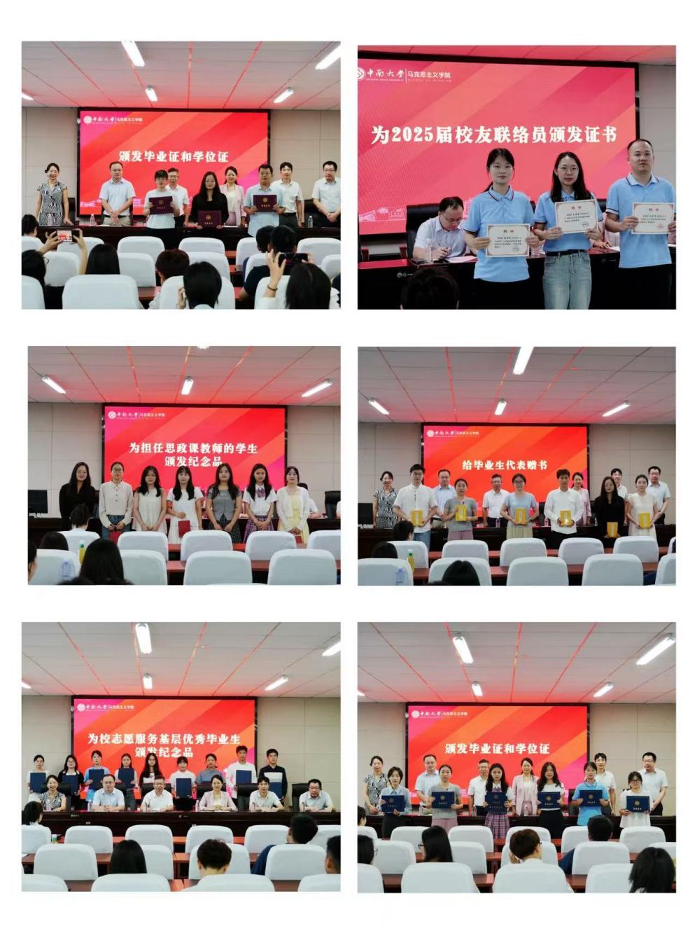 随后进入颁证与表彰环节。胡栋材副院长宣读了学院2025届本硕博毕业生名单。胡晓副院长为2025届校友联络员颁发聘书。胡腾蛟副院长向即将奔赴思政课教师岗位的毕业生赠送纪念品。院领导为毕业生代表赠送书籍,勉励他们持续学习,不断进步。在热烈的掌声中,院领导依次为全体毕业生颁发了毕业证书和学位证书。汪平书记和曹清燕院长分别为志愿服务基层的优秀毕业生和校优秀毕业生颁发纪念品。