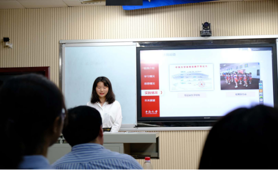 随后,同学们一一上台进行自我陈述,作为国家奖学金申请者之一的2018级思想政治专业的朱冰扬同学从学习情况、思想情况、实践情况、未来展望等几个方面展开自己的答辩。她说道她将继续用奋斗的精神在学习道路上前行,学习进步的思想并以此为指南针,继续做一名斜杠青年,让自己的人生充满更多可能性。