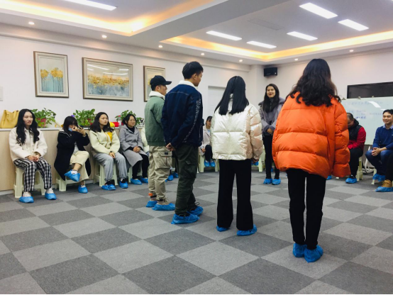 第一环节是热身活动,同学们围成一个圆圈,后面的同学把手搭在前面的同学身上,并为前面的同学锤肩揉背,然后角色互换,前面的同学又为后面的同学锤肩揉背,在愉快的氛围中,同学们增进了彼此的感情。