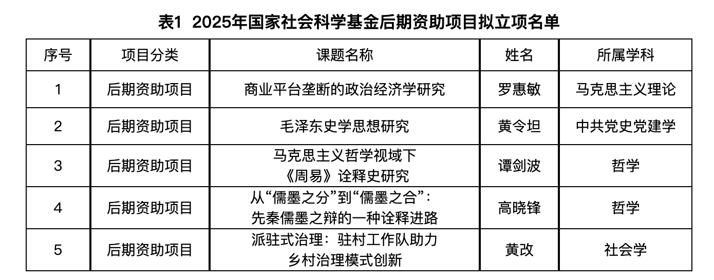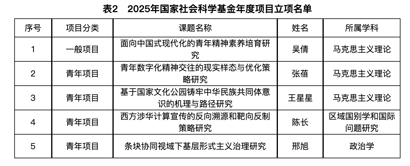 近日,2025年国家社会科学基金后期资助暨优秀博士学位论文出版、优秀学术著作再版项目拟立项名单公布,我院共5个项目获得立项。2025年9月29日,2025年国家社会科学基金年度项目立项结果公布,我院共5个项目获得立项。截止目前,我院已获批2025年国家社会科学基金项目10项,创学院历史新高。以下为我院获立项目情况: